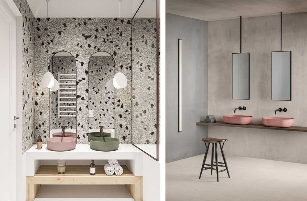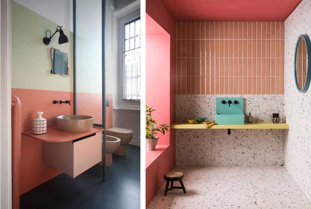 특히 핑크톤이나, 민트 그린, 파랑과 연그레이의 파스텔 색조가 가장 선호되는 색상들인데요. 이 때 중요한 포인트가 있다면, 바로 광택이 없이 매트하게 마감처리가 되어야 한다는 점입니다. 그리고, "할머니의 욕실"같은 느낌이 나지 않기 위해서는, 욕실웨어와 세면대를 동일한 색으로 하는 것만은 피해야 합니다.