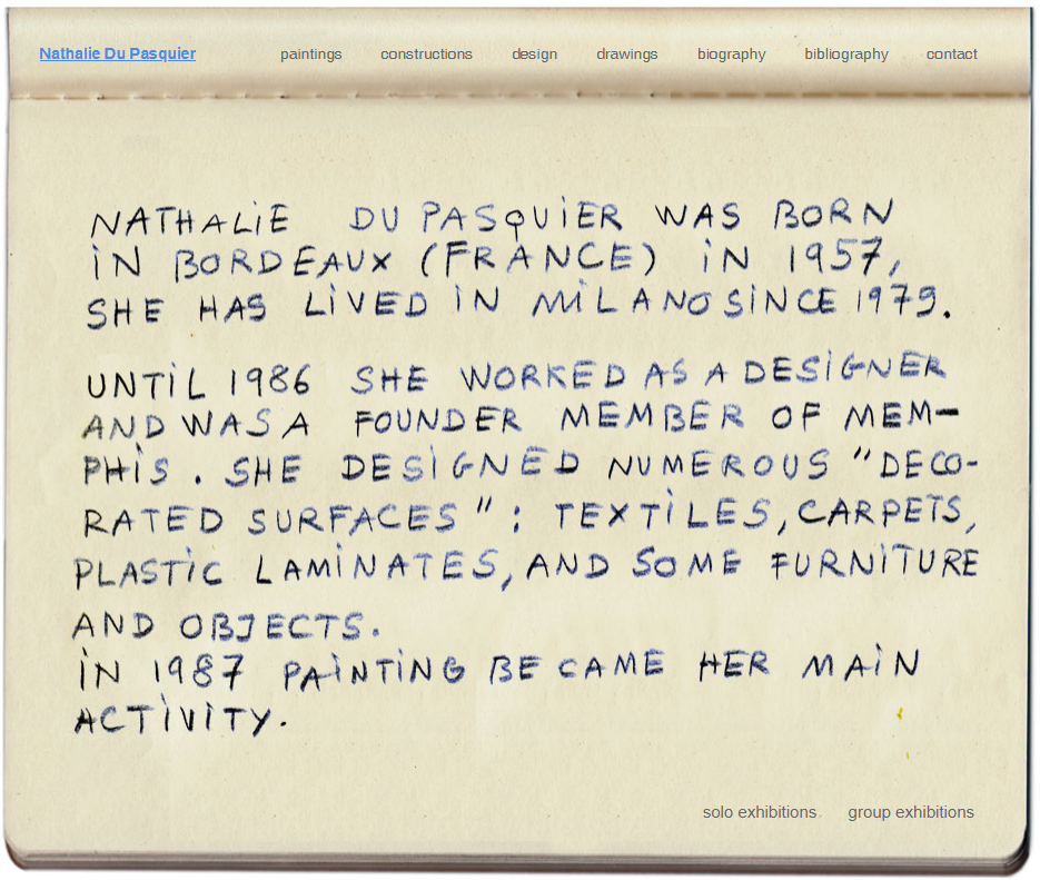 이제 다시 서두의 나탈리 뒤 파스키에로 돌아가보겠습니다. 제가 한 눈에 반한 그림을 남긴 이 화가는 멤피스 그룹의 창립 멤버로, 1957년 프랑스 보르도에서 태어났습니다. 1797년까지 밀라노에서 살며 작업활동을 펼쳤고요. 1986년까지는 멤피스 그룹에 소속되어 섬유, 카페트, 가구 및 오브제 디자이너로 활동했습니다.