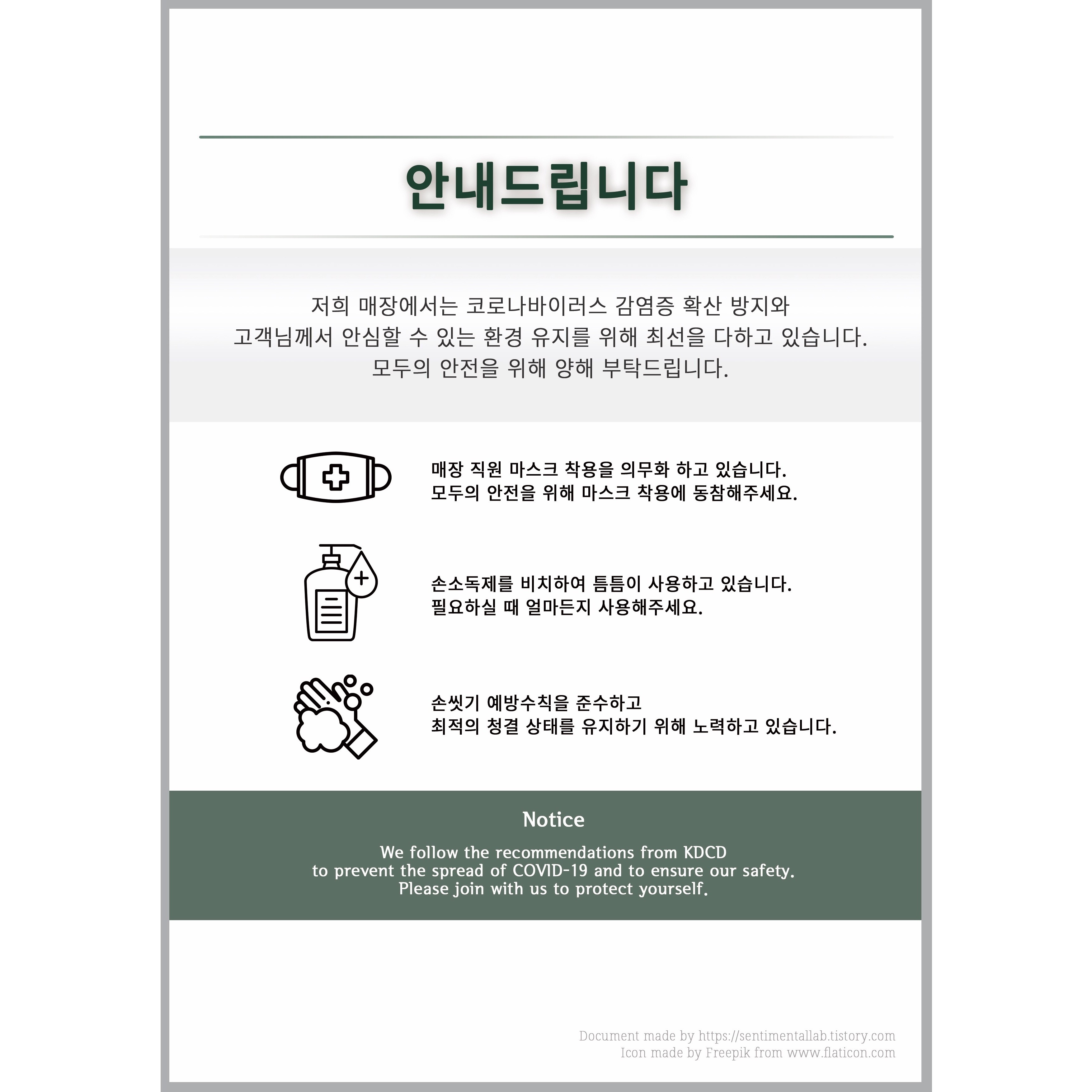 업무상 코로나 바이러스 관련 안내문이 필요해 후딱 제작했는데, 혹시나 필요하신 분들이 있으실 것 같아 공유드리려 합니다. 저처럼 급히 안내문이 필요하실 수도 있을 것 같아요.