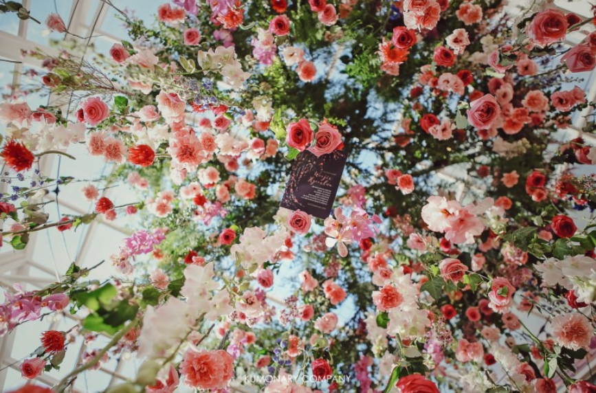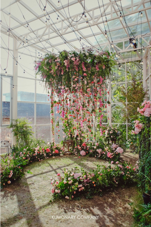 복합문화공간 엘리스몽드에 다양한 핑크톤 플라워와 그린소재로 만든 대형 오브제를 매달아, 정말이지 화려하고 로맨틱한 꽃비가 내리는 것 같은 분위기를 연출했습니다.