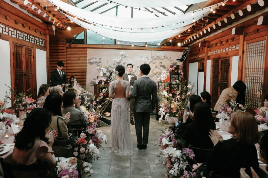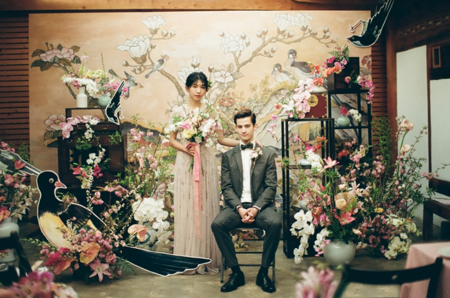 먼저 한옥 복합문화공간 핸더스에서 진행된 예식 장식입니다. 민화 '화조도'를 모티브로 스타일링한 공간으로, 한국적인 그림과 새 모양의 오브제, 그리고 동양적인 팔래놉시스와 도자기까지 고전적이면서도 현대적인 느낌이 가미된, 유니크한 분위기가 완성되었습니다.