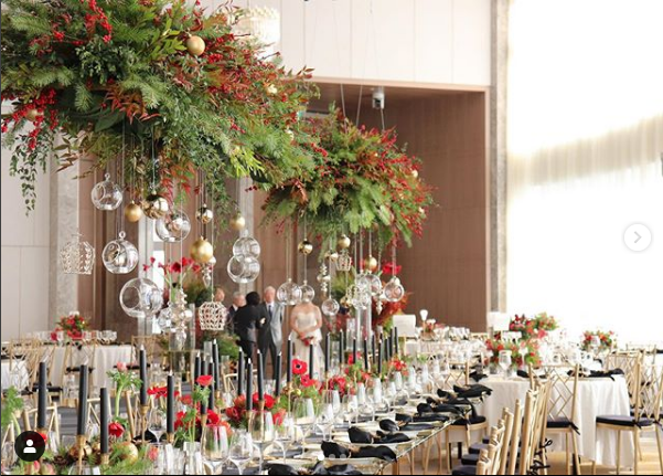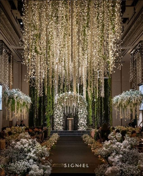 압도당할만큼 화려한 반짝반짝한 행잉 라이트와 흰색 꽃잎줄들, 풍성한 아치에 절로 감탄이 나오지 않으신가요.