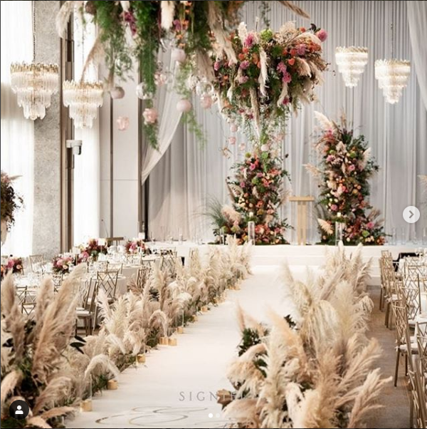 메인으로 사용한 팜파스그라스에 핑크톤 꽃들을 매치해, 가을느낌이 물씬 나면서도 로맨틱한 분위기의 예식공간이 완성되기도 하고요.