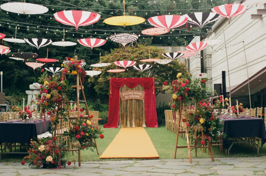 아래 역시 세상에서 하나뿐인 느낌의 공간입니다. 풍성한 주름의 레드 커텐에 화려한 무늬의 우산들. 흥겨운 무대가 열릴 것 같은 느낌이 드는데요. 음향감독과 연출가라는 신랑 신부의 스토리가 고스란히 담긴 듯 합니다.