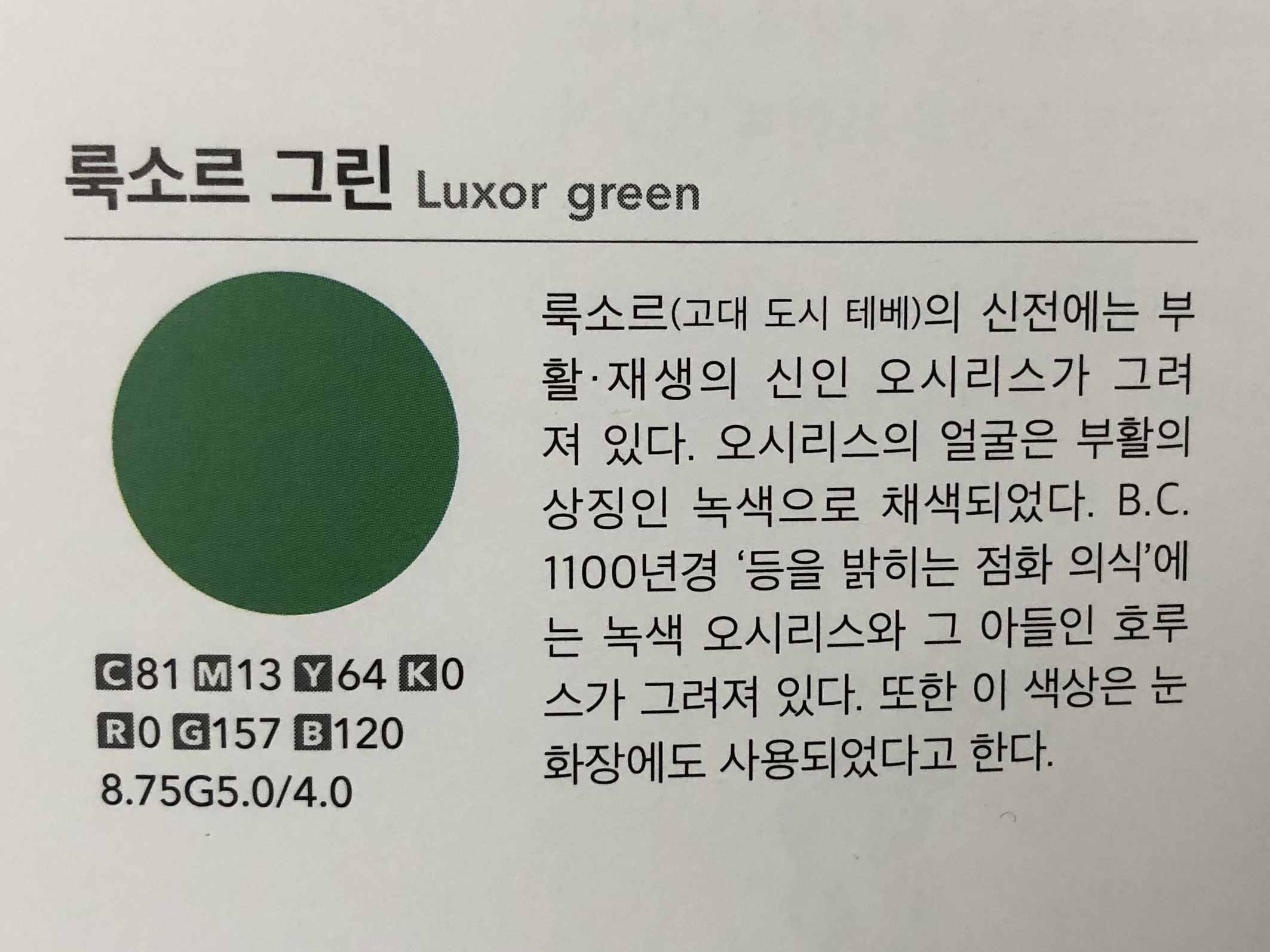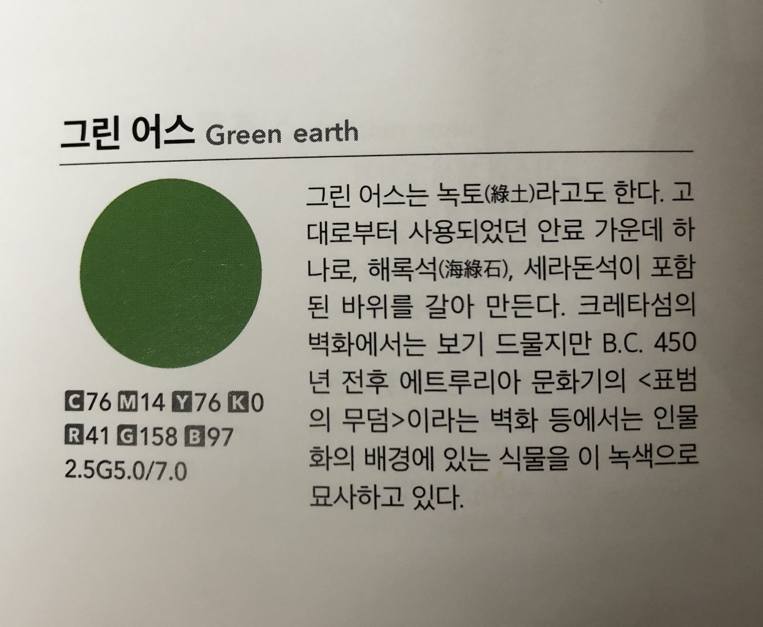 소설 주인공의 조카의 차량 색상을 표현한 단어였는데 구글링을 해봐도 정확한 컬러가 나오지 않는 걸 보면 고유명사는 아닌 듯 싶었습니다. 마침 시대별로 색상팔레트를 소개하고 있는 책을 읽고 있던 지라, '고대'에 사용되었다는 그린 색상들을 몇 보내드리며 그 즈음의 색감이 아닐까 싶다고 회신을 드렸습니다.