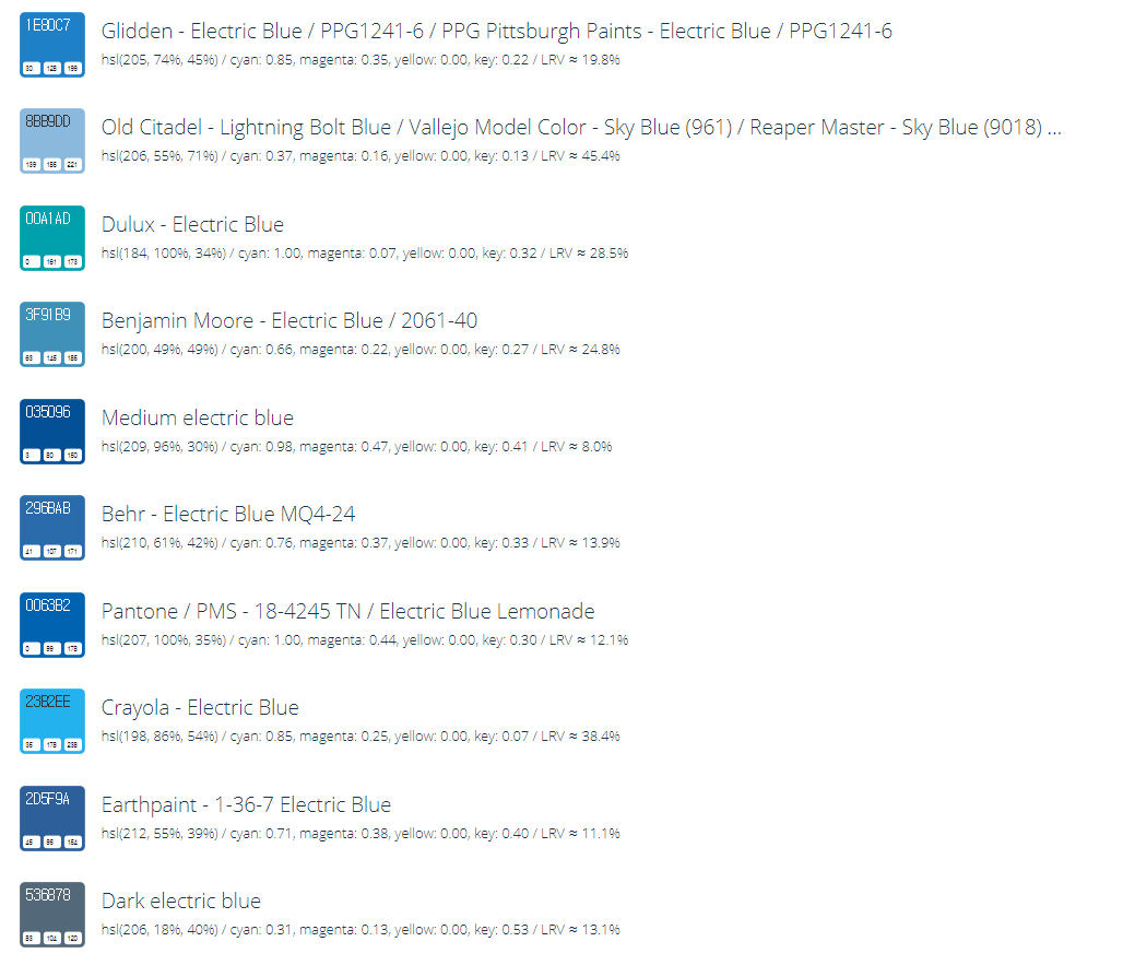 물론 '코발트 블루'(C100,M58,Y0,K33)처럼 일정한 범주의 색상값으로 정의되고 있는 공인된 색상명들도 있습니다. 하지만 통용되는 색상명이라도 조금씩 다른 색상을 나타내는 경우도 많습니다. 'Electric blue'라는 동일한 명칭이 업체마다 조금씩 다른 색감의 색상들로 해석되고 있는 것처럼요.