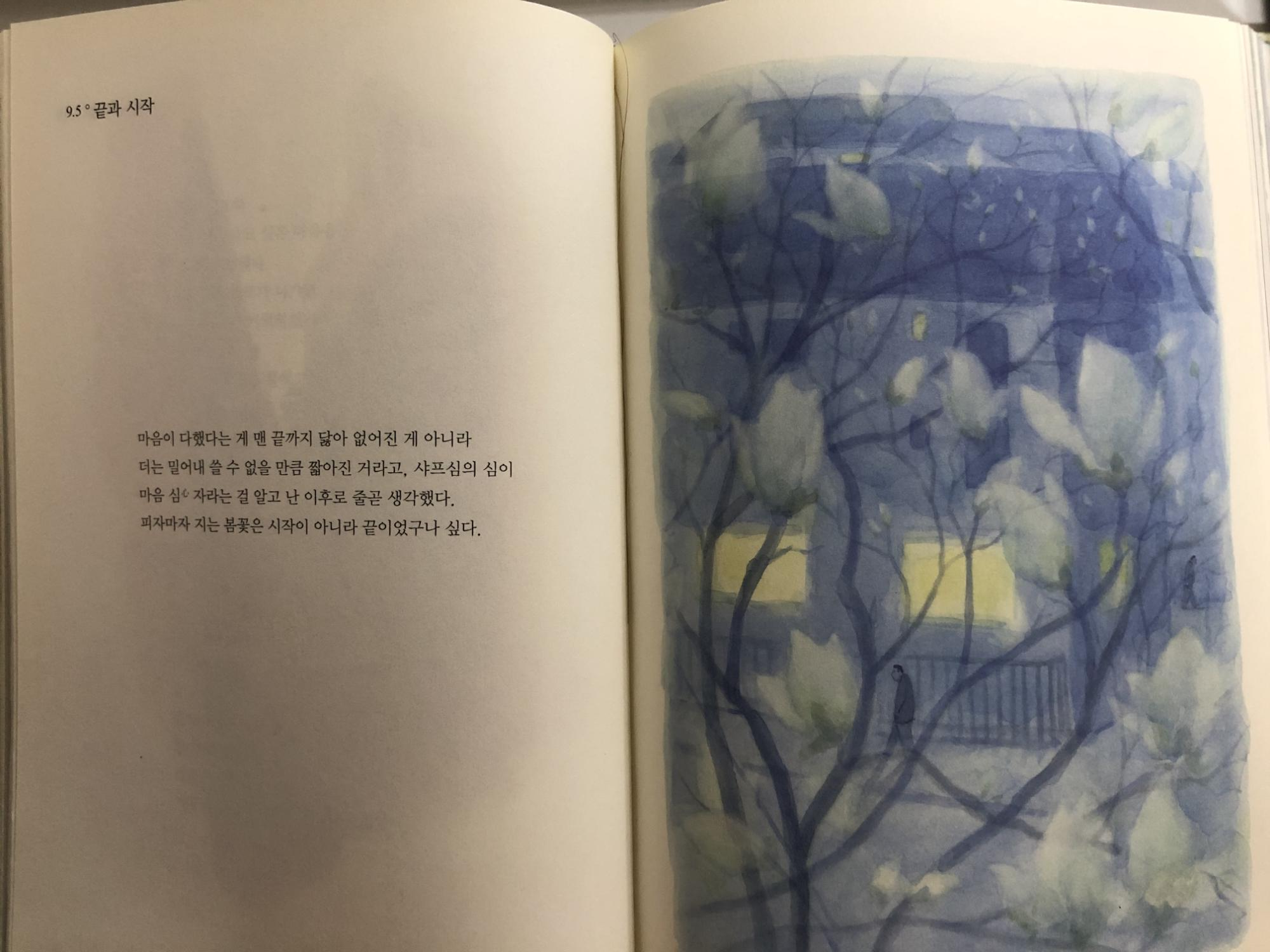 "나무가 풍경이 되었으면 좋겠다고 생각했다. 한 해의 시작인 겨울부터 끝인 겨울까지 하루하루가 어떤 흔적을 남기는지 모아보고자 했다. 그리하여 마음속에 담긴 익숙한 무늬 하나쯤, 저만의 파문을 만들며 유유하기를 바라는 마음으로 쓰고 그렸다." (10)