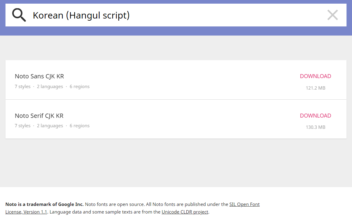 한글의 경우 노토 산스 CJK KR(Noto Sans CJK KR)와 노토 세리프 CJK KR(Noto Serif CJK KR)의 경우 한글 폰트가 제공되고 있지요.