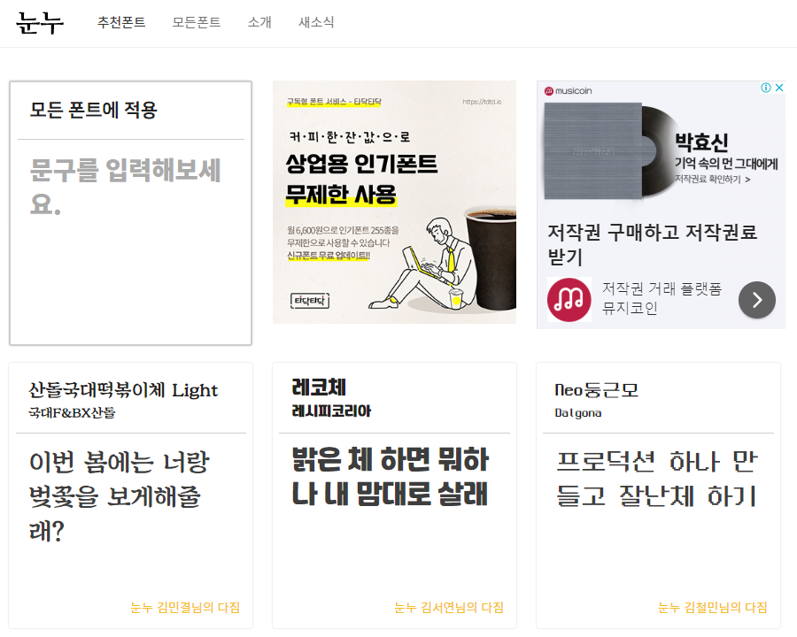 눈누(https://noonnu.cc/index)는 상업적으로도 이용할 수 있는 무료 한글 폰트들을 모아둔 사이트입니다. 개인이나 기관 등 다양한 곳에서 제작된 한글 폰트를 무료로 다운로드 받으실 수 있고요. 바로 폰트를 입력해서 확인할 수 있는 창이 붙어 있어서 글씨체를 확인하기도 편리합니다. 들어가보시면 개성이 많은 다양한 글씨체들을 만나보실 수 있는데요. 시간이 많을때 둘러보시다가 예쁜 것들 다운받아놓으면 필요할 때 쏠쏠히 쓸 수 있을 거예요.