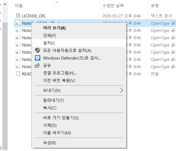 한편 구글에서 배포하고 있는 Noto 폰트에서도 한글이 무료로 제공하고 있습니다.(https://www.google.co.kr/get/noto/) 검색창에서 Korean, English 등 원하는 언어를 검색하면 사용할 수 있는 글씨체를 확인할 수 있구요. 그 중 마음에 드는 것들을 다운로드하여 사용하면 됩니다.