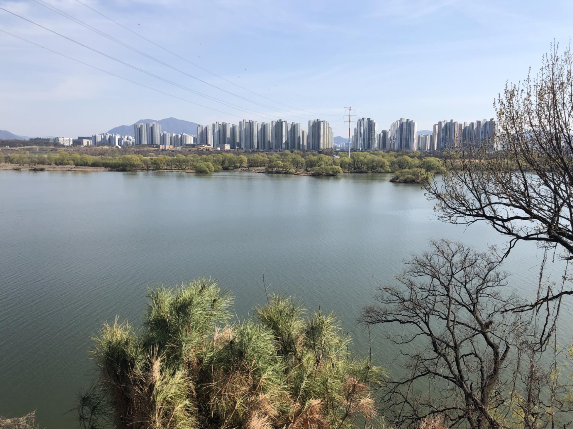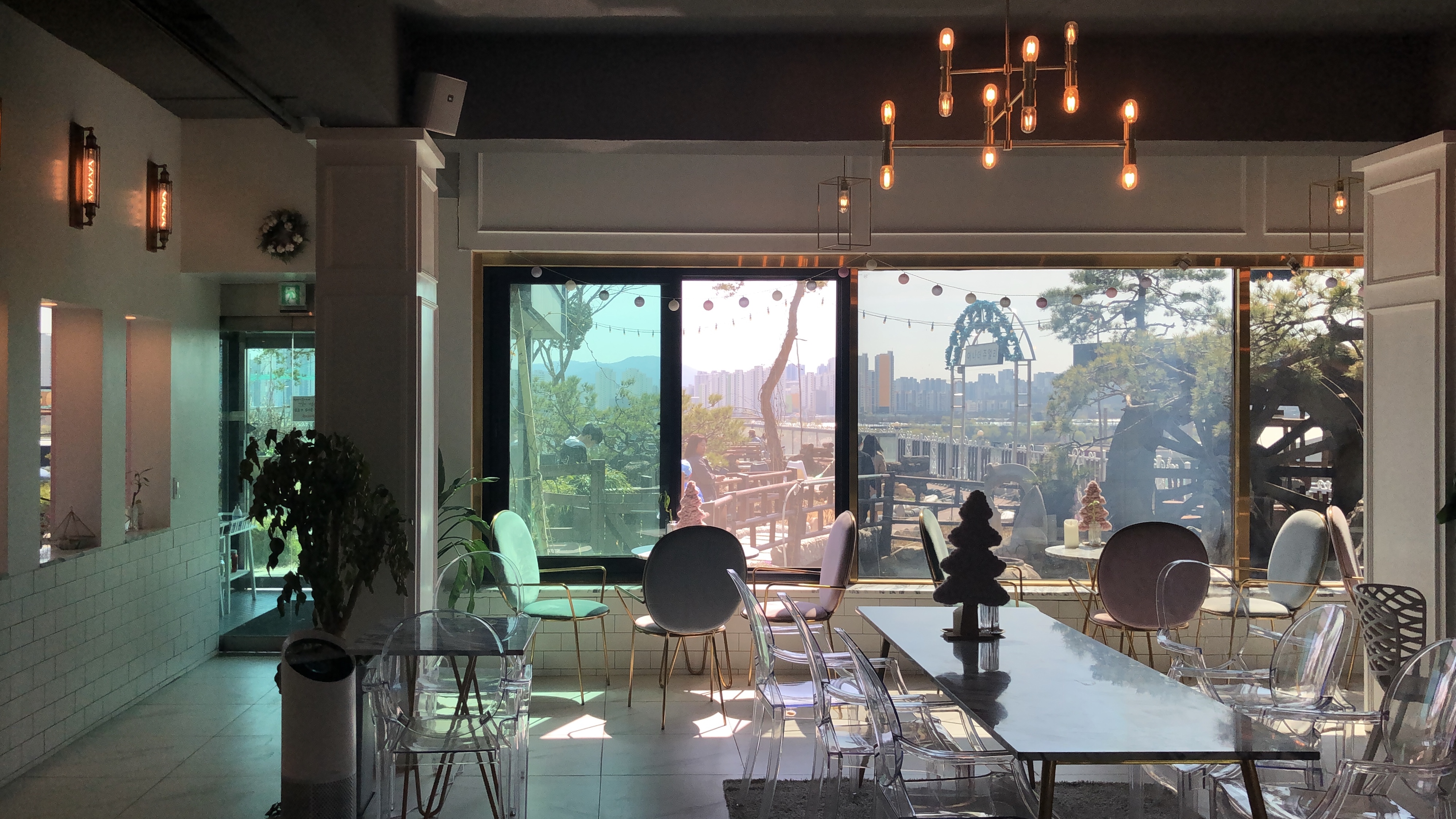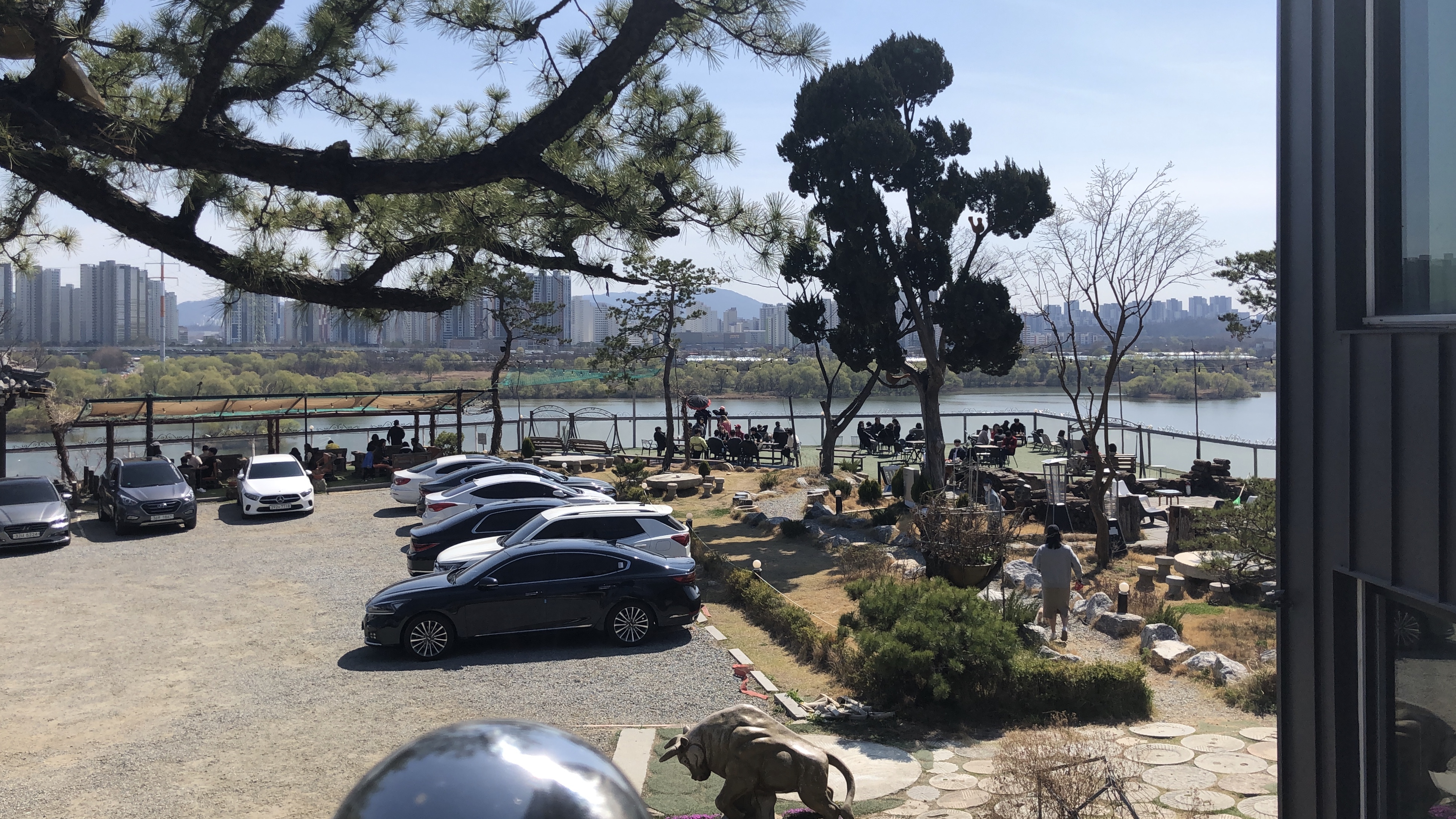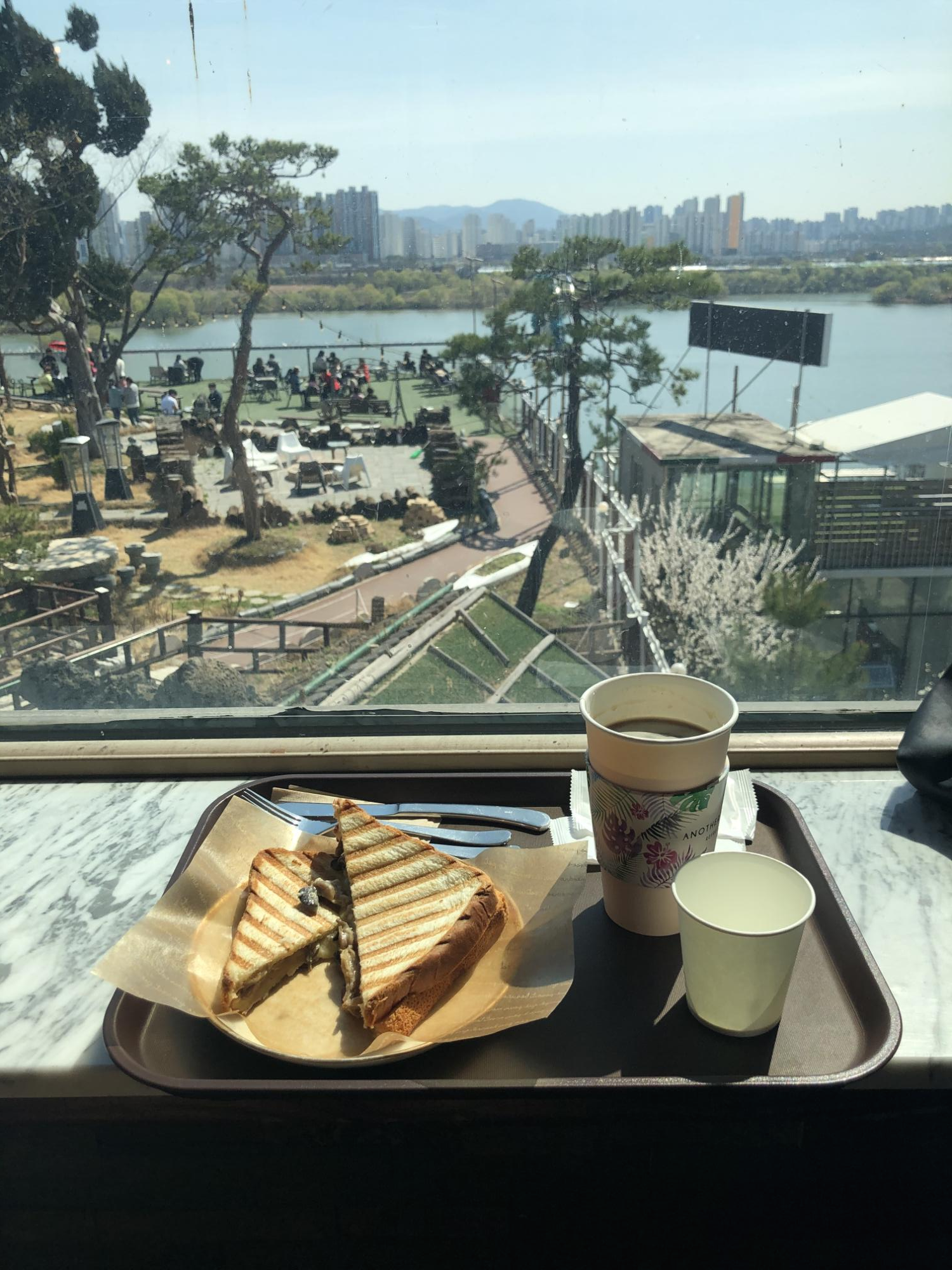 창가자리에서는 풍경을 보며 커피 한잔 할 수 있습니다. 한강변에 한창 새순이 돋아나는 중인 파릇파릇한 버드나무가 어찌나 예쁘던지요. 다들 예쁜 강아지 한마리씩을 데려와서. 강아지 구경하는 재미도 쏠쏠했습니다. (나만 없는 그 댕댕이가 주는 박탈감에 살짝 배가 아프기도 했지만.;)